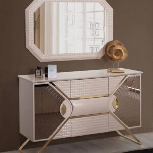 Signature Nightstands: Includes two matching side tables featuring unique geometric cut-outs and glass-top finishes to complement the bed’s metallic accents.