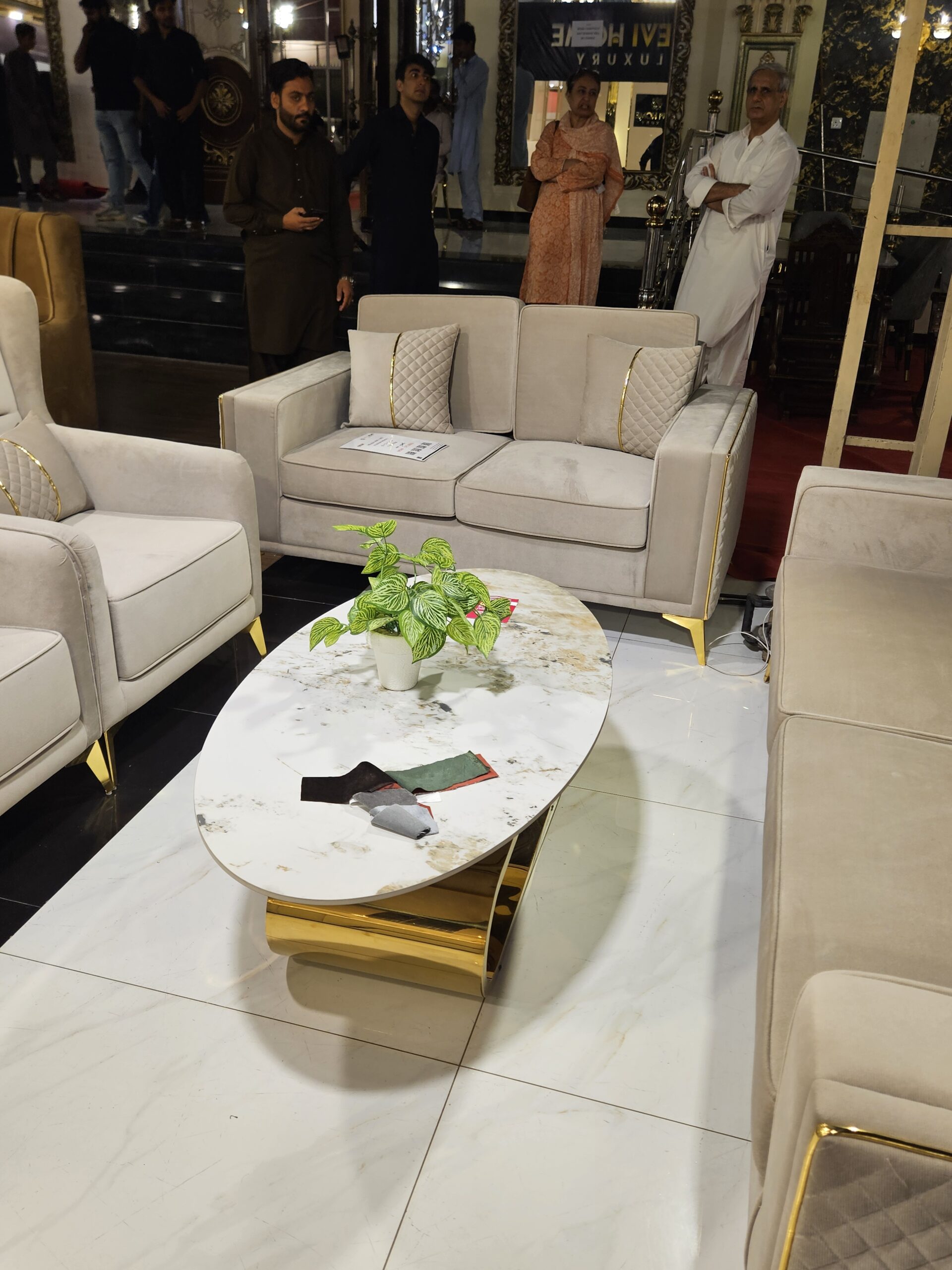 The Centerpiece: Complemented by an oval coffee table featuring a white faux-marble top and a bold, polished gold sculptural base.