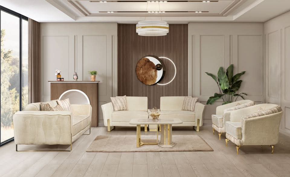 Signature Turkish Framing: The sofas feature a continuous gold-metal sled base and vertical gold trim on the armrests, providing a cohesive “royal-modern” look.