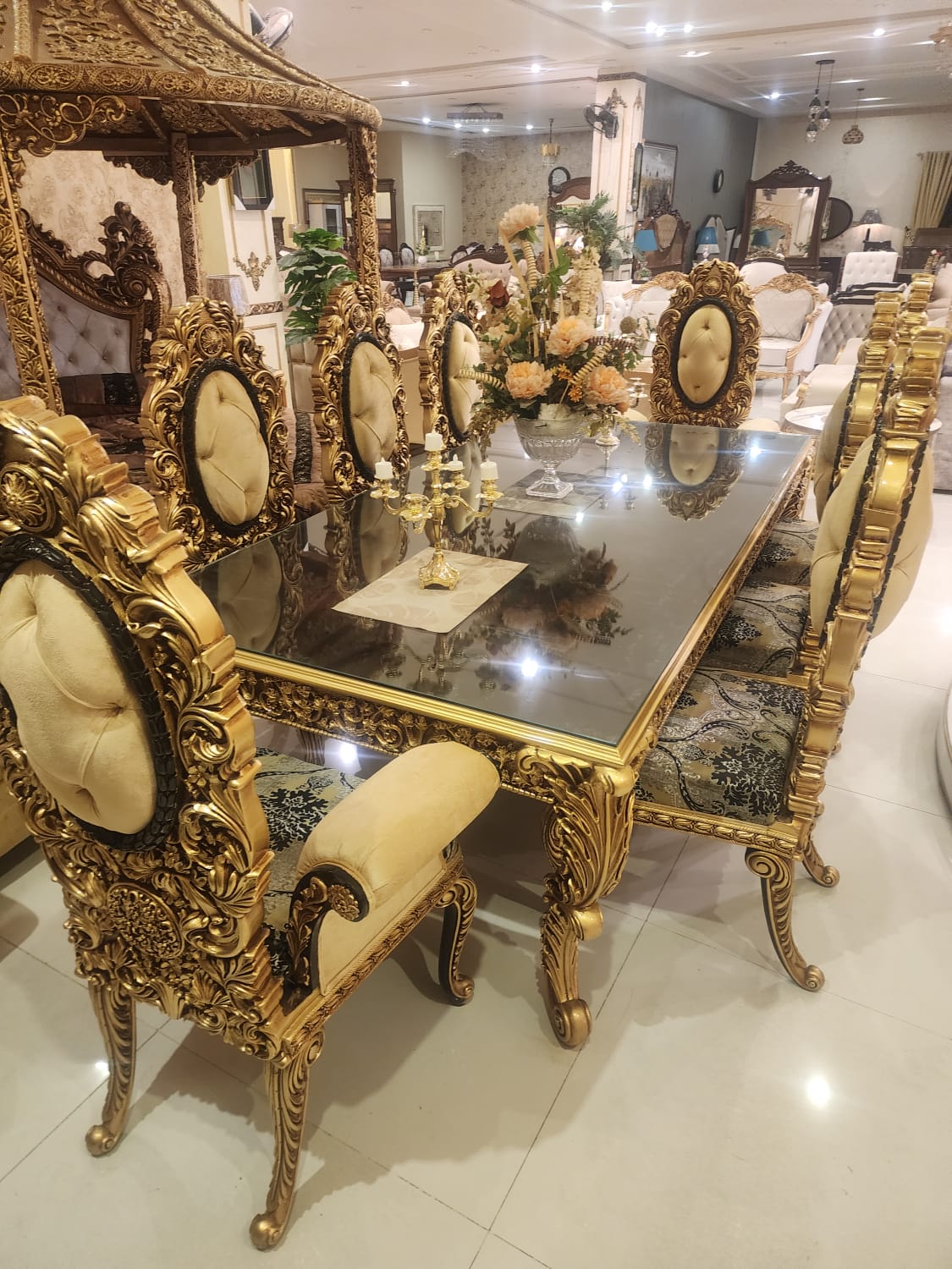 The Crown Jewel of Your Dining Room Elevate your formal gatherings with our Royal Ottoman Dining Set. Designed for those who seek the highest level of classic Turkish aesthetics, this set combines the legendary woodwork of Chinioti heritage with sophisticated Turkish Baroque styling.